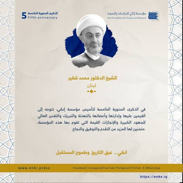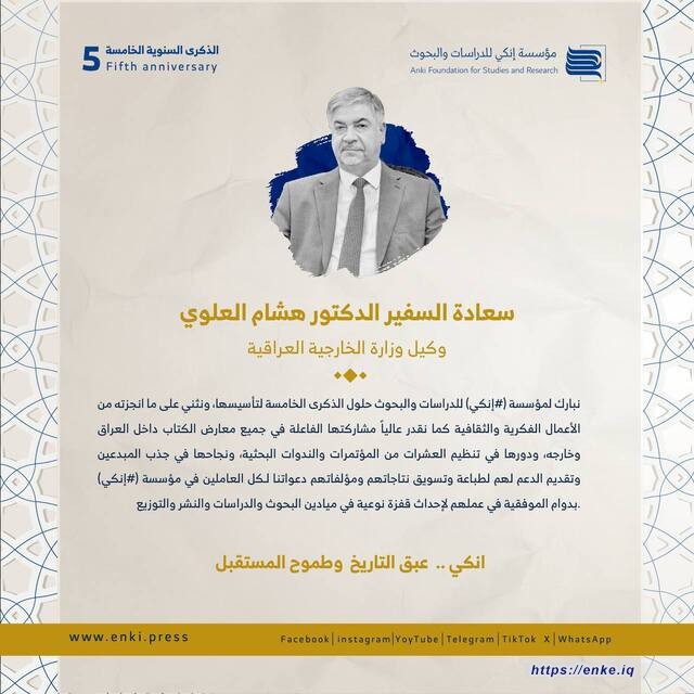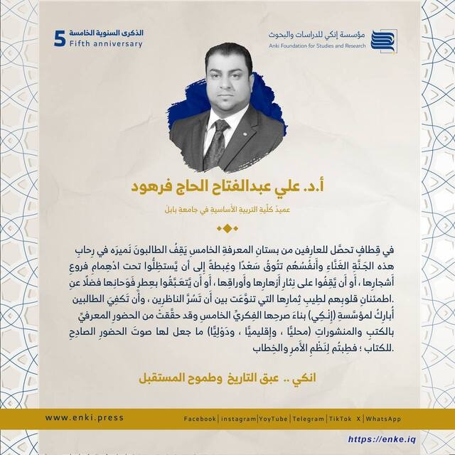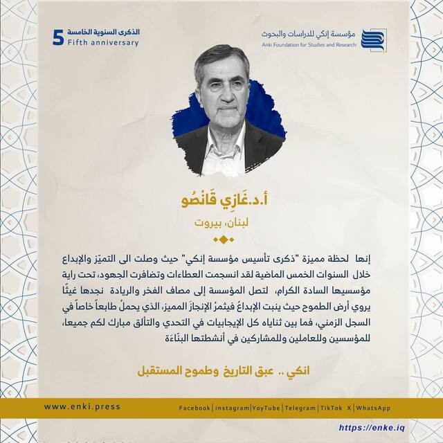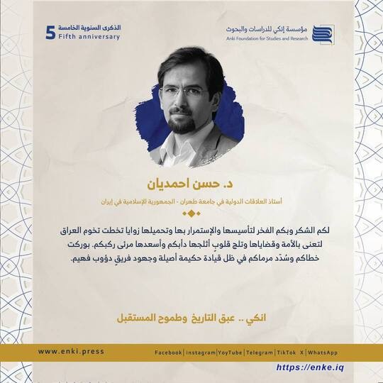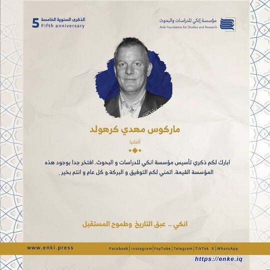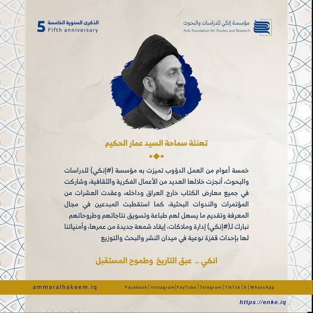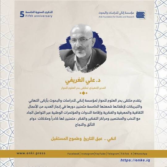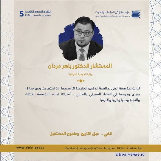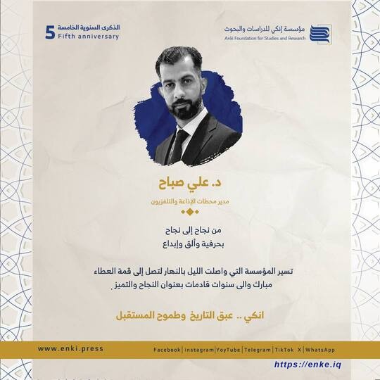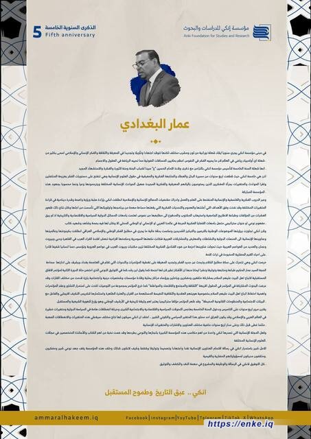 بمناسبة الذكرى الخامسة لتأسيس مؤسسة إنكي للدراسات والبحوث، يسعدني كرئيس للمؤسسة، أن ألقي الضوء على مسيرتنا الملهمة التي إنطلقت بدعم وتوجيه سماحة السيد عمار الحكيم ( اعزه الله ) .