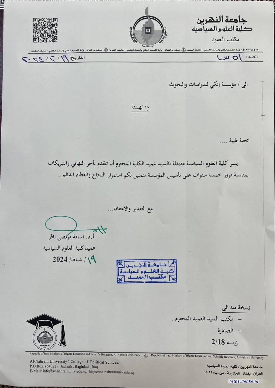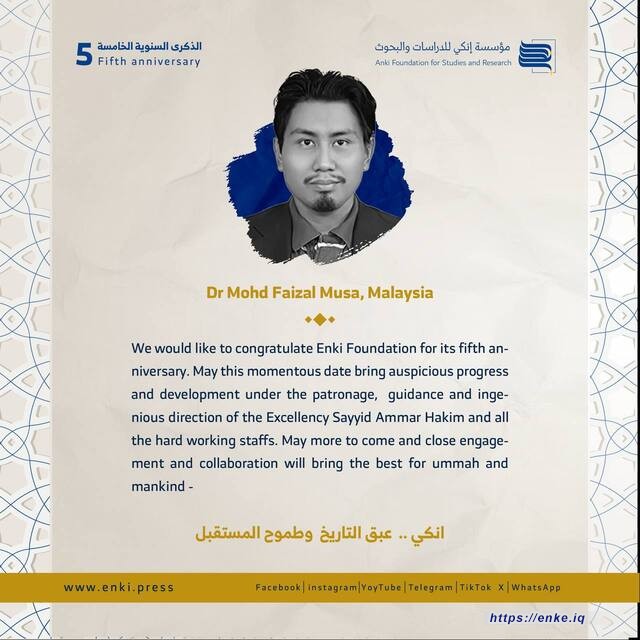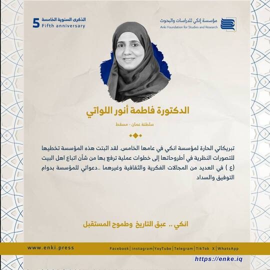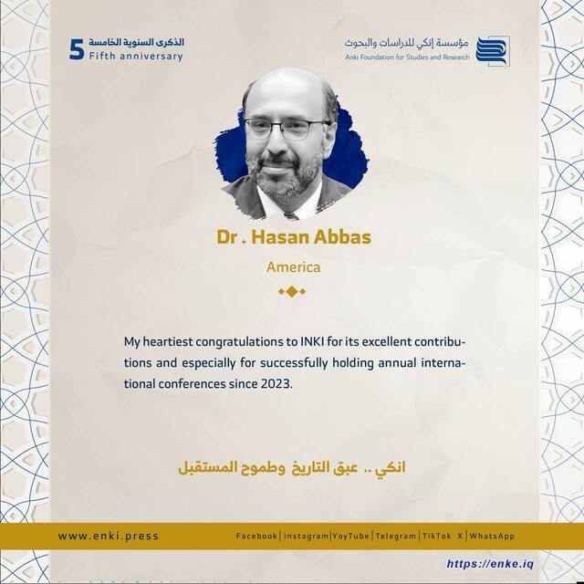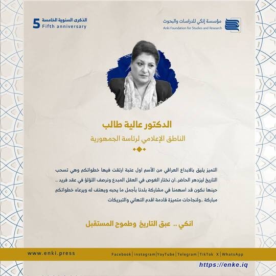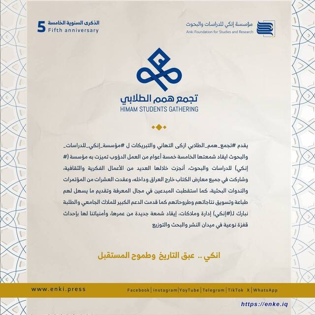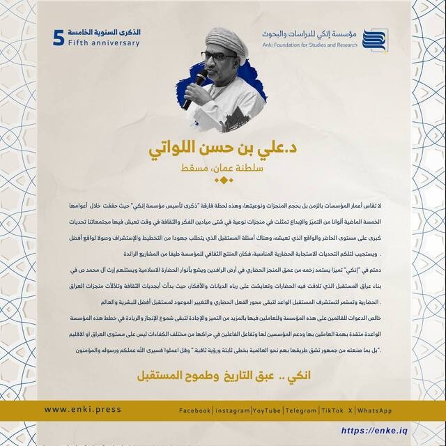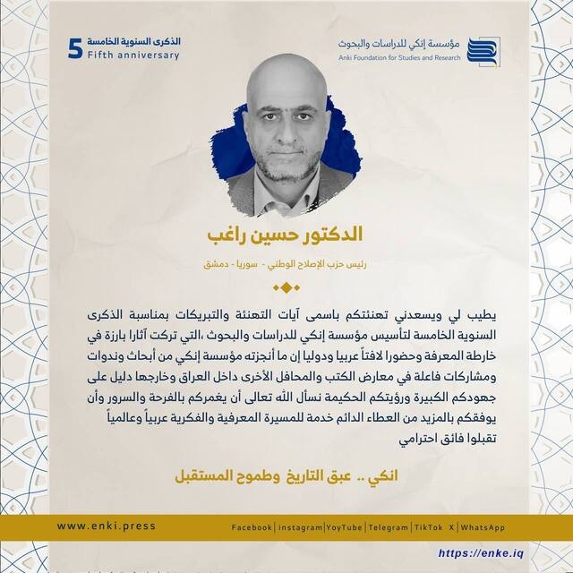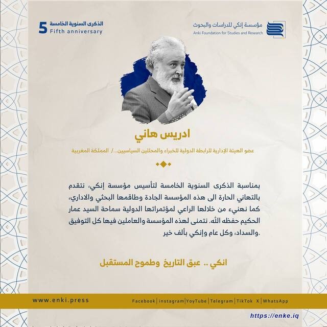 بمناسبة الذكرى الخامسة لتأسيس مؤسسة إنكي للدراسات والبحوث، يسعدني كرئيس للمؤسسة، أن ألقي الضوء على مسيرتنا الملهمة التي إنطلقت بدعم وتوجيه سماحة السيد عمار الحكيم ( اعزه الله ) .