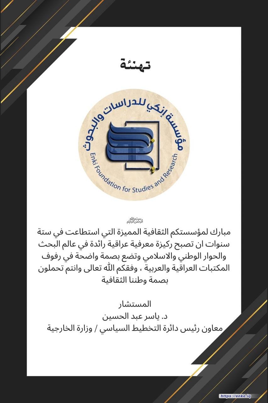 نبارك لكم ولكوادر وأعضاء مؤسسة إنكي الذكرى السادسة لتأسيسها، والتي تُعَدُّ أحد أهم الصروح الفكرية العراقية، حيث شكَّلت منذ انطلاقها إضافة معرفية مميزة للواقع الثقافي العراقي.