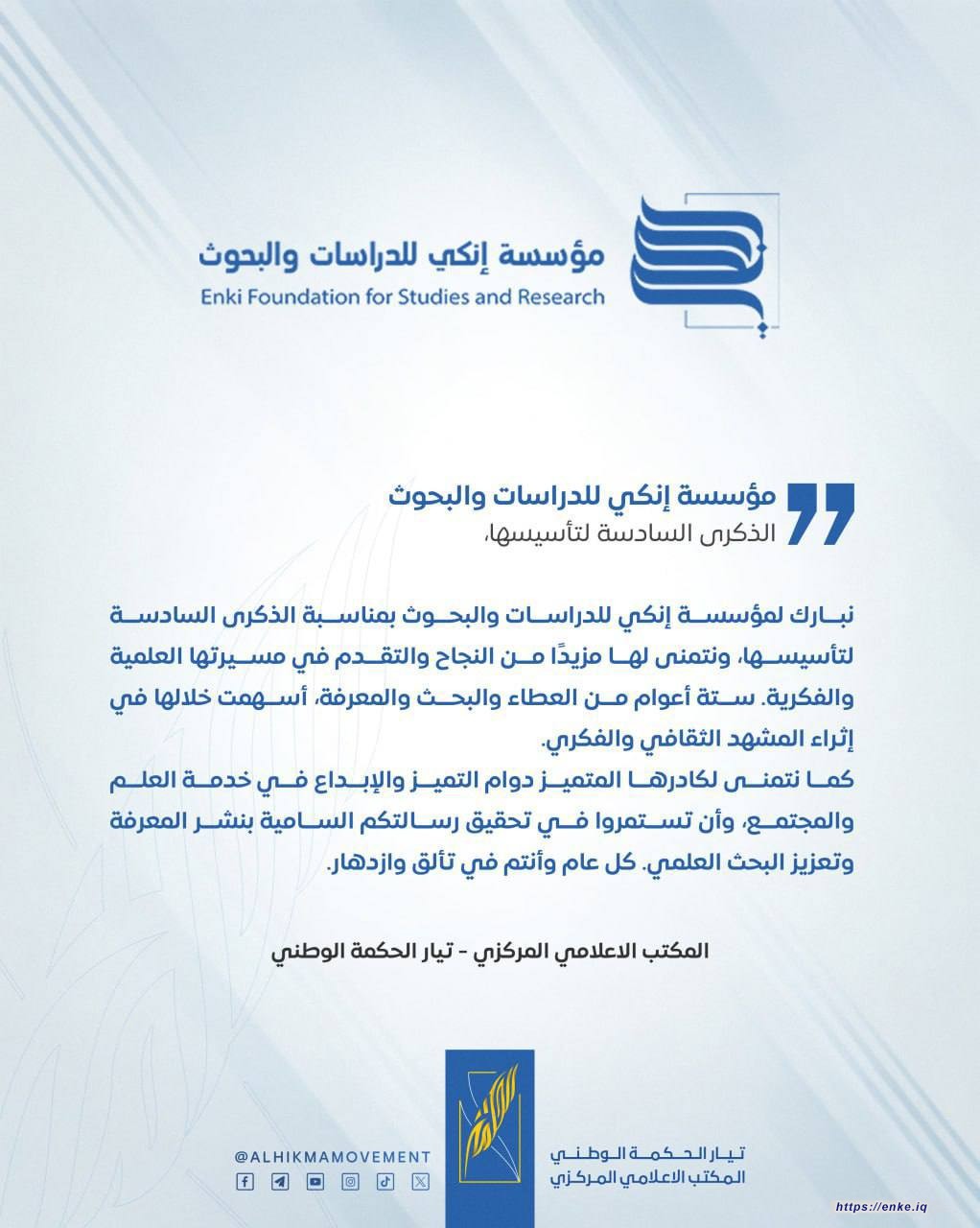 تهنئة بمناسبة الذكرى السنوية السادسة لتأسيس مؤسسة إنكي للدراسات والبحوث